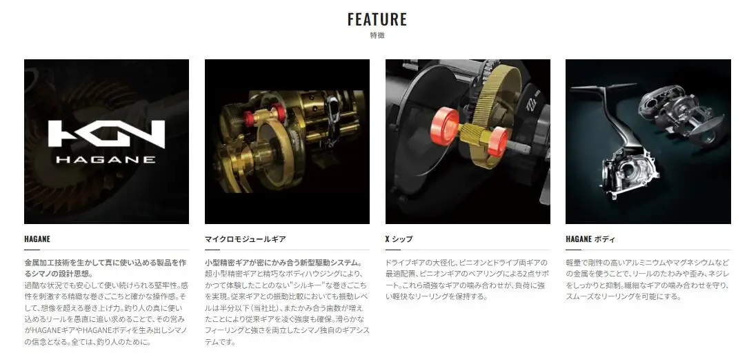 MicroModule - As engrenagens com a tecnologia Micromodule proporcionam um recolhimento suave, mesmo após repetidas utilizações. O sistema consiste em fabricar engrenagens com dentes altamente refinados, em maior quantidade e mais unidos. Como resultado, há redução de ruídos e aumento da sensibilidade. A combinação destas engrenagens precisas protegidas por um corpo metálico altamente rígido, o HAGANE Body, torna possível o recolhimento sempre suave.